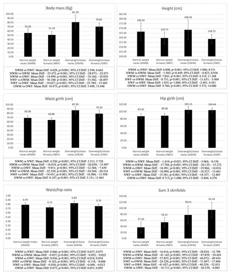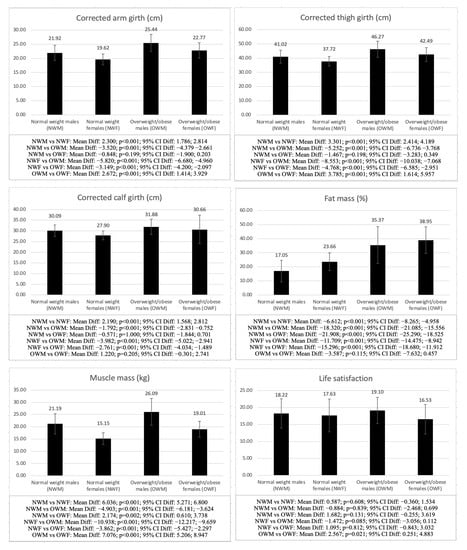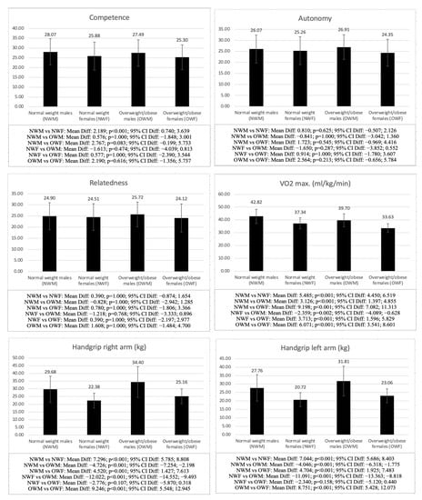 Regarding the comparison between males and females with the same weight status (NWM vs. NWF and OWM vs. OWF), the differences were significant in all the variables analyzed between NWM and NWF, except for life satisfaction (p = 0.608), autonomy (p = 0.625), relatedness (p = 1.000), and AMD (p = 1.000), while in the comparison between OWM and OWF, the differences were also significant in all the variables analyzed, except for hip girth (p = 1.000), corrected calf (p = 0.205), fat mass (p = 0.115), basic psychological needs (p = 0.213–1.000), physical activity level (p = 0.272), and AMD (p = 1.000), with males in both groups obtaining higher scores in all the variables (p < 0.001), except for the sum of 3 skinfolds (p < 0.001), fat mass (p < 0.001) and sit-and-reach test (p < 0.001), for which the females showed higher values.