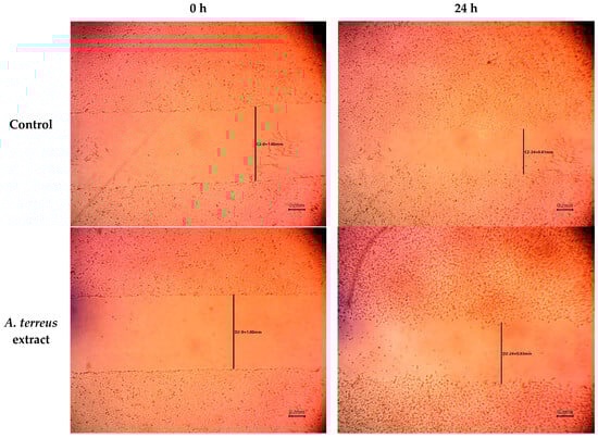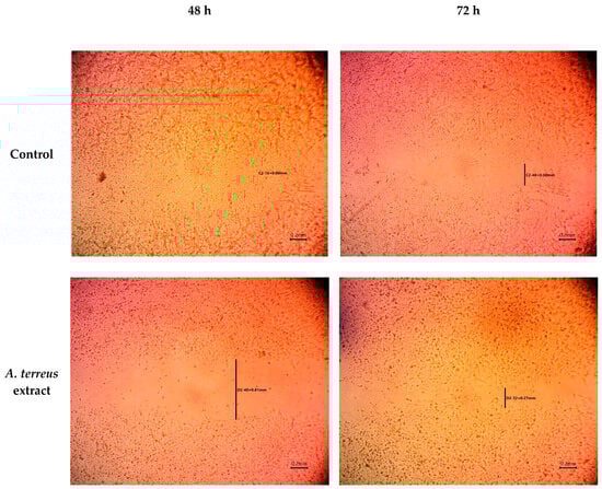 The A. terreus extract was assessed for its wound healing activity via the in vitro cell migration of the HSF cell line. As shown in Table 1, the drug displayed a moderate inhibition impact on cell migration with significantly slower wound closing within the treated group in comparison to the control, which in the tested time maintained some capacity for tissue repair (Figure 1). Also, the scratch wound width decreased as cell migration was induced. Slower closure may indicate a more controlled and organized migration of cells, leading to better tissue integrity and reduced scarring. Rapid closure can sometimes result in inadequate cellular signaling and incomplete repair mechanisms. The extract may promote a more balanced healing process that allows for appropriate remodeling of the extracellular matrix and tissue repair, which is crucial for optimal recovery.