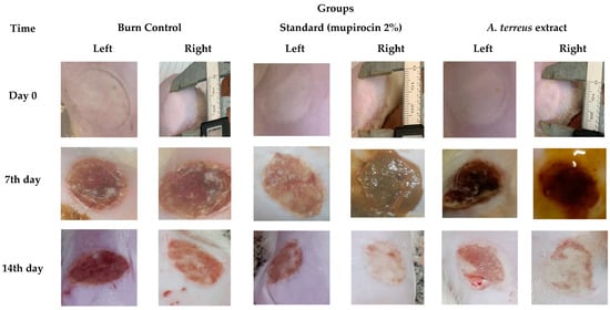 After burn induction, pale lesions of circular scars were observed in treated as well as untreated animals. Blisters had appeared at 2 h, which palled at 6 h, and ruptured at 12 h, and blister size increased up to about a 20 mm diameter. In animals treated with A. terreus extract, wounds showed fluid leakage on the first day. On the third day, most of the wounds initially observed had slight oozing, but this subsided by the fifth day in all groups. Seven days later, a firm, red scab covered the healing wound that was already smaller in size but lasted longer, up until the 10th day in one untreated animal. In contrast, the treated animals had nearly healed wounds by Day 14, in which we could clearly see that the skin had regenerated over the area (Figure 2).