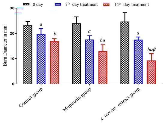 Burn wound’s contracture rate for the burn groups over time intervals. a Significantly different from Day 0 at p ≤ 0.05; b Significantly varied from 7th day at p ≤ 0.05; α Significantly varied from corresponding 7th day of control group at p ≤ 0.05; β Significantly different from corresponding 14th day of mupirocin group at p ≤ 0.05.