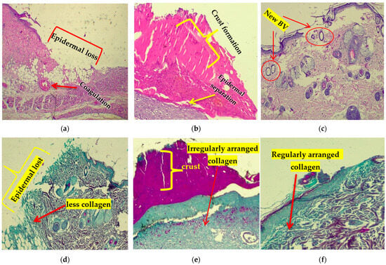 The skin samples from normal and wounded rats were preserved. The process involved two steps: fixation and dehydration. Fixation included submerging tissues in 10% buffered formalin for 24 h, followed by a 30-min distilled water rinse. Dehydration used a sequence of alcohol solutions (70%, 90%, and 100%). After that, samples were cleared with xylene, impregnated with paraffin wax, and sectioned (4–5 µm) for staining as described by Suvarna et al. [], using hematoxylin and eosin stains, to identify various tissue abnormalities.