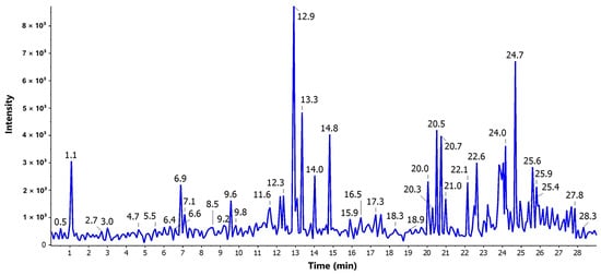 In total, 27 compounds were tentatively identified by analysis of their MS1 precursor ion, chemical formula, and fragmentation patterns compared with the CFMID online database. The results shown in Table 3 are arranged according to identified compounds’ retention times.