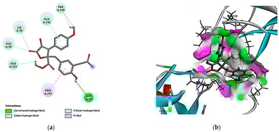 The interaction diagram (Figure 6) shows that versicolactone A (14) interacted with seven amino acid residues in the NF-κB-active site. Specifically, the compound interacted through conventional hydrogen bonding with Asp A53, indicating strong interactions that might contribute to the compound’s affinity, together with the carbon-hydrogen bond with Phe A239, Gln A241, Lys A28, Glu A49, and Glu A225 amino acid residues. Additionally, hydrophobic contacts were formed, which stabilized the ligand through non-polar interactions.