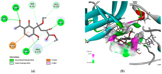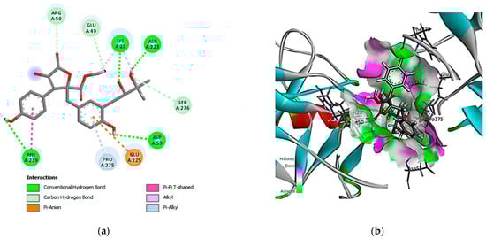 Finally, aspernolide D (16) exhibited interactions with nine amino acid residues, in which four were conventional hydrogen bonds (Lys A28, Asp A223, Asp A53, and Phe A239), three carbon hydrogen bonds (Arg A50, Glu A49, and Ser A276), and pi-anion, pi-pi, alkyl, and pi alkyl interactions, indicating strong interactions with these residues in the binding pocket (Figure 8).
