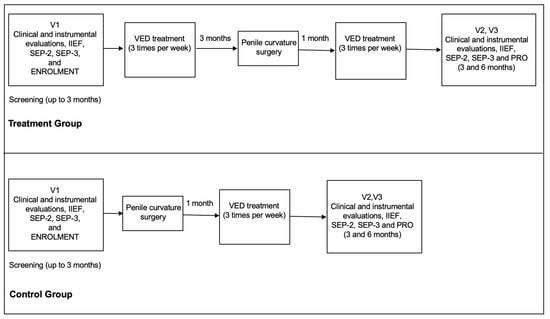 The primary outcome was to evaluate superiority of neo-adjuvant therapy with VEDs in patients’ candidates to penile curvature surgeries when compared with penile curvature surgery alone, in terms erectile function domain score (International Index of Erectile Function, PDQ, SEP-2, and SEP-3) and patients satisfaction (PROs). Moreover, the penile length change was considered a secondary outcome measure.