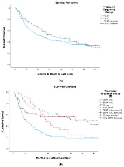 We categorized patients into 2 groups according to treatment sequences. The first-line targeted treatment (1L-TT) group included patients who received at least one cycle of first-line BRAF ± MEK inhibitors, with or without subsequent PD-1 ± CTLA-4 inhibitors, and vice versa for the first-line immunotherapy (1L-IO) group.