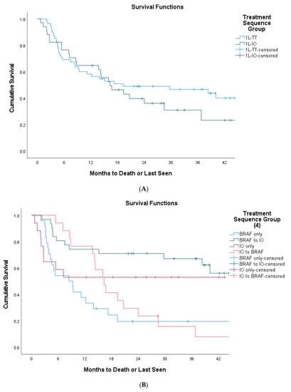 Sensitivity analyses survival outcomes excluding BRAF V600D and unknown subtypes (n = 89). (A) Overall survival of 1L-IO vs. 1L-TT Group in BRAF V600E/K-mutant population only (16.3 vs. 19.3 months, p = 0.230); (B) overall survival of ‘1L-IO only’ vs. ‘1L-TT to 2L-IO’ vs. ‘1L-IO to 2L-TT’ vs. ‘1L-TT only’ in BRAF V600E/K-mutant population only (NR vs. NR vs. 16.3 vs. 8.4 months, p < 0.001); (C) survival from second-line treatment to time of death/last follow up as per 1L-IO vs. 1L-TT group only’ in BRAF V600E/K-mutant population only (8.8 vs. NR, p < 0.001).