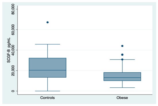 SCGF-β serum levels were 13.113 (9.976–18.299) pg/mL in this obese patients cohort, while were 29.247 (13,215.38–32,345.12) pg/mL) in subjects used as reference, with two-sample Wilcoxon rank-sum (Mann–Whitney) test evidencing significant lower median values of SCGF-β in the obese patients cohort (z = 3.471, p = 0.005), (Figure 1).