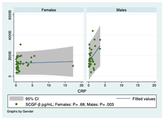 Prediction of SCGF-β serum concentrations by C-reactive protein (CRP) levels. CRP, C reactive protein. Y-axis reports SCGF-β serum concentrations. The regression line, obtained by linear regression, in the graph of males is sloped at an angle confirming that there is a strong relationship. CRP is expressed in mg/mL.