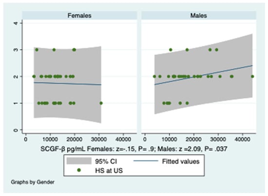 Prediction of the severity of hepatic steatosis at ultrasonography by SCGF-β levels. Y-axis reports the severity of hepatic steatosis. There is a gender-related difference of SCGF-β levels in predicting the severity of hepatic steatosis at ultrasonography, HS at US, expressed in grades (1–3). Ordered probit regression. A linear regression analysis was performed.