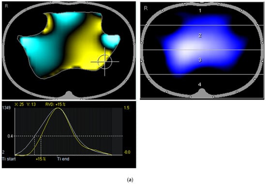 To further check the lung function ventilation, we performed chest electrical impedance tomography (EIT) to visualize regional lung ventilation. With the help of EIT, impedance changes of the lungs, which change with the air content in healthy lungs by a factor of 300, can be measured via electrodes on the body surface (Figure 1) [].