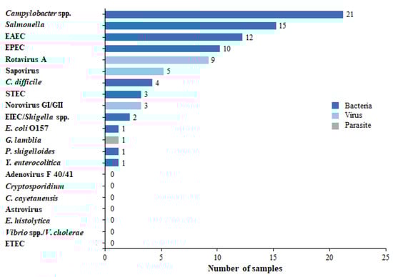 A total of 88 pathogens were detected in the 61 positive samples. Among the 61 positive results, 43 (70.5%) were attributed to bacterial etiology with the most common bacteria being Campylobacter (21/43, 48.8%) and Salmonella (15/43, 34.9%) (Figure 1); 17 (27.9%) patients had a viral etiology, with the most common viruses being Rotavirus (9/17, 52.9%) and Sapovirus (5/17, 29.4%); and only one parasite (1/61, 1.6%) was detected—G. lamblia.