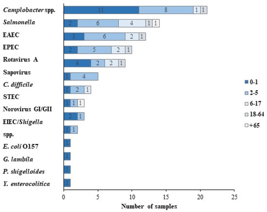 The analysis of pathogens by age group showed that Campylobacter was the most common pathogen among children in their first year of life (52.4%) and in the 2–5 years group (34.8%). Similar findings were reported in a previous study according to which Campylobacter caused the highest associated burden of diarrhea in 0–1-year-old children from Loreto, Peru and Venda, and South Africa []. Generally, certain age groups including children below the age of 4 and people older than 75 years are more vulnerable to Campylobacter infections []. Risk factors to gastroenteritis in young children include high exposure to outsourced food services, in which food handling, storage and cooking might sometimes be improper [].
