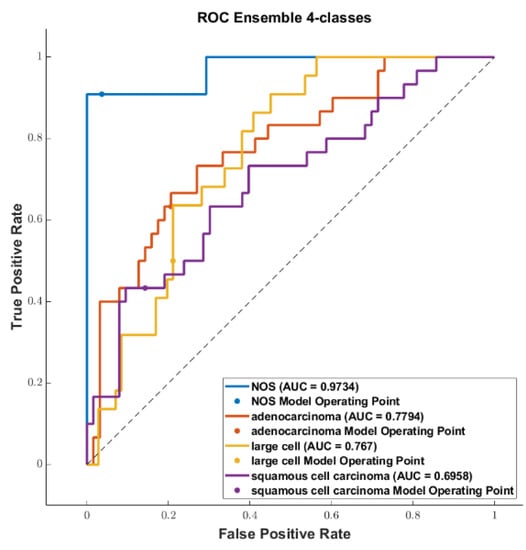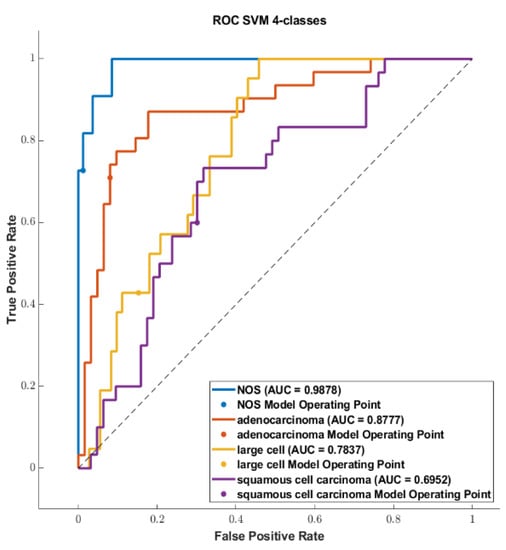 Regarding NSCLC, radiomics studies have focused on predicting mediastinal lymph node metastasis [29]. More specifically, they were mostly focused on only differentiating between the two NSCLC subtypes, such as SCC and ADC [30,31,32,33,34], rather than focusing on multi-subtype classification [35,36], which is crucial since treatment strategies strongly depend on the NSCLC subtype. Moreover, the differentiation between lung adenocarcinoma and lung squamous cell carcinoma subtypes has also been investigated in the field of genomics, and it was through a novel explainable AI(XAI)-based deep learning framework [37] that promising results were achieved.