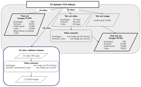 We used a dataset consisting of 154 CE videos collected retrospectively from 2 university hospitals (Dongguk University and Soonchunhyang University) with the approval of the individual, institutional review board. CE was performed between 2016 and 2021 using PillCam SB3 (Medtronic, Minneapolis, MN, USA).
