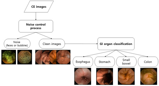 Since randomly extracted images may include inappropriate images containing feces or bubbles, we added a noise control process to filter them. Then, the GI organ classification algorithm was developed to divide images into four GI organs: the esophagus, stomach, small bowel, and colon.