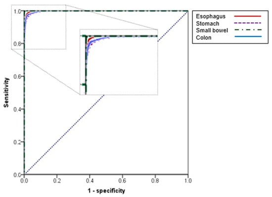 Receiver operating characteristic curve of the convolutional neural network for classifying GI organs.