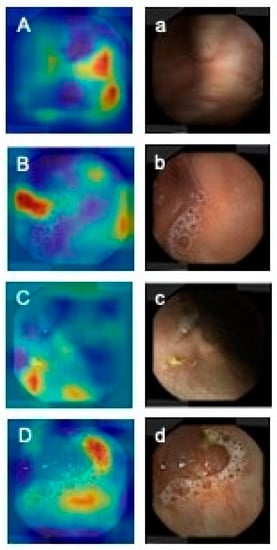 Representative cases of incorrectly predicted classes in the test dataset using the no-code tool. (Left) Gradient-weighted class activation mapping image. (Right) White-light imaging capsule endoscopic image. (A,a) Esophagus, but predicted as the stomach; (B,b,C,c) stomach, but predicted as the small bowel; (D,d) colon, but predicted as the esophagus.