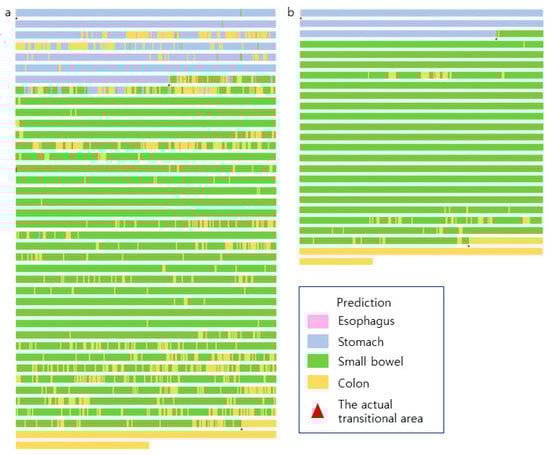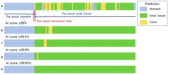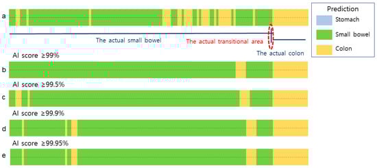 We visualized the prediction results by listing them in a time sequence. Despite our AI model’s high performance, there is a limit to detecting the transitional area at once when applied to all images of each CE video because the result is not sequential but rather scattered (Figure 6a). Therefore, we attempted to present the transitional area by compressing the images by gradually increasing the cut-off of the AI score. The transitional area was visualized more clearly without a loss of information as the threshold increased to 99.9% and 99.95% from the default (Figure 7 and Figure 8). Figure 6 compares the clarity of the GI organ classification before and after the AI score control.