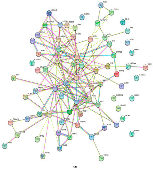 Chanukuppa et al. employed a variety of bioinformatics tools, including Ingenuity Pathway Analysis (IPA), Protein Analysis through Evolutionary Relationships (PANTHER), Search Tool for the Retrieval of Interacting Genes/Proteins (STRING), and Database for Annotation, Visualization, and Integrated Discovery (DAVID), to investigate protein–protein interactions and their networking pathways. They proved that marginal zone B and B1 cell specific protein (MZB1) were expressed substantially differently in MM mononuclear cells (MNCs) isolated from MM patients. Upregulation of the MZB1 protein is one of the indicators for the pathogenesis and progression of MM and is anticipated to be a promising biomarker in the future [136].