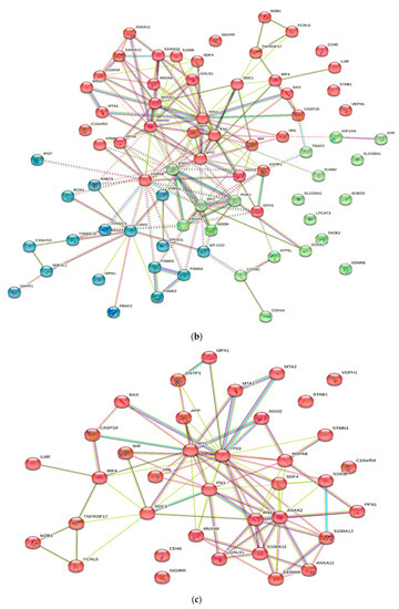 Protein–protein interaction network in active MM disease. Nodes represent proteins and edges represent protein–protein associations. The edges are composed of known and predicted interactions, among other forms of interaction, including co-expression (STRING https://string-db.org/) accessed on 3 March 2023. (a) Full STRING network. The edges indicate both functional and physical protein associations. (b) Full STRING network in cluster. Protein–protein networking in Cluster 1 (c), Cluster 2 (d), and Cluster 3 (e). The full STRING analysis report can be found at https://version-11-5.string-db.org/cgi/network?networkId=bwimO6bRnH24 accessed on 3 March 2023.