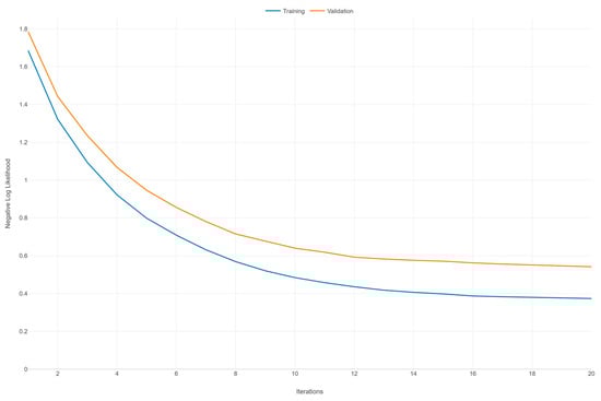 Figure 2 illustrates the learning curves for an XGBoost model, depicting the negative log likelihood (NLL) against the number of iterations for both the training and validation datasets over 20 iterations. Both curves (training and validation) exhibit a general downward trend as the number of iterations increases. This indicates that the model is learning and improving its performance over time, with the NLL decreasing, which corresponds to better model predictions. The training NLL starts at around 1.6 and decreases steadily, flattening out to around 0.4 after 20 iterations. This consistent decrease signifies that the model is fitting the training data increasingly well. The validation NLL starts at around 1.8 and also decreases, but at a slower rate compared to the training curve. By the end of 20 iterations, it levels out around 0.6. The slower decrease compared to the training curve suggests that the model’s performance on unseen data is improving but not as rapidly as on the training data.