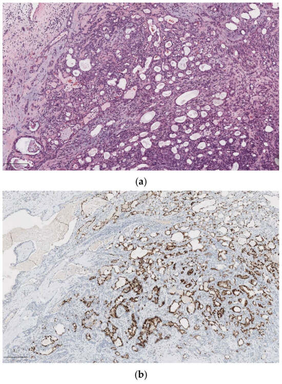 Cases of sclerosing microcystic adenocarcinoma have been reported in the oral cavity and other mucosal head and neck sites [44]. It is composed of cords and nests of neoplastic cells immersed in a desmoplastic stroma, exhibiting a biphasic cellular pattern that includes peripheral myoepithelial cells and cuboidal ductal cells, with eosinophilic secretions within the ducts. This tumor subtype is characterized by the positivity of luminal cells in immunohistochemistry for cytokeratin 7, while the peripheral myoepithelial cells show positivity for smooth muscle actin, S100, p63, and p40 [21].