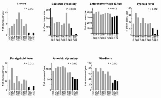 In Japan, the Infectious Diseases Law instructs physicians to report all cases of 77 designated important infectious diseases. These 77 diseases include seven gastrointestinal infections with mandatory reporting, namely cholera, bacterial dysentery, enterohemorrhagic Escherichia coli, typhoid fever, paratyphoid fever, amoebic dysentery, and giardiasis. The National Institute of Infectious Diseases provided us with this incidence data for those seven diseases []. We compared the numbers of new cases reported in the period before the COVID-19 pandemic (2012–2019) versus those during the pandemic (2020–2022).
