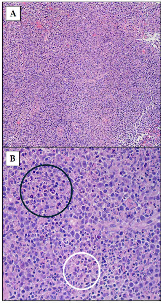 Hematoxylin and eosin (H&E)-stained sections of a lymph node showing karyorrhectic debris (black circle) with histiocytes showing crescentic nuclei (white circle). Microscopic images were examined at 100× (A) and 200× (B) objectives.