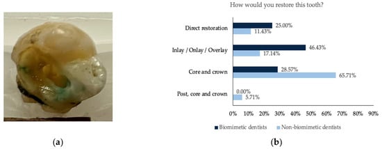 For all five teeth (Figure 1, Figure 2, Figure 3, Figure 4 and Figure 5), survey responses showed a statistically significant difference in the restorative decision of full coverage versus alternative restorations, with dentists trained in biomimetic dentistry selecting a direct restoration or inlay/onlay in lieu of a full coverage crown (n = 63, p < 0.05). The age of the participant did not have a significant impact on the restorative decision making process for these teeth. There was no significant difference between biomimetic training and the choice of placement of a post (n = 63, p > 0.05). For all respondents across all teeth, the volume of tooth loss was the most selected rationale for their restorative decision, irrespective of their biomimetic training and age. With regards to the use of a post, both dentists with or without training in biomimetic dentistry did not opt for a post, though the rationale selected by the dentists trained in biomimetic dentistry was that the use of a post would be detrimental to the tooth, whereas dentists not trained in biomimetic dentistry selected that there was sufficient tooth structure.