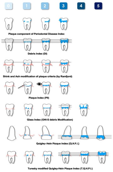 Schematic representation of the most-used plaque indices based on non-quantitative methods. Pink lines represent the gingival margin, blue areas represent plaque deposits.