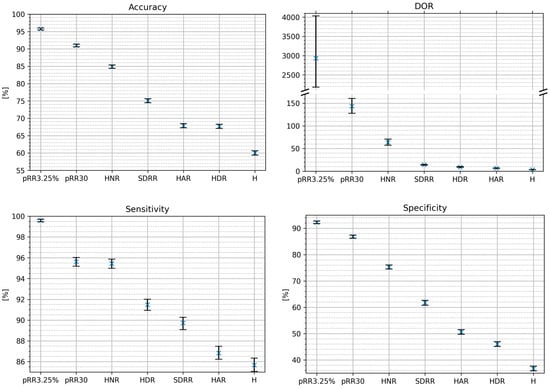 Figure 6 shows the classification metrics for AF detection on the testing dataset using the optimal cut-off method for single HRV parameters. For every metric, the best score achieved three parameters: pRR3.25%, pRR30 and HNR. The NPV difference between pRR30 and HNR was the smallest. The whiskers on the plots represent 95% confidence intervals from the bootstrap.