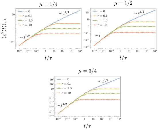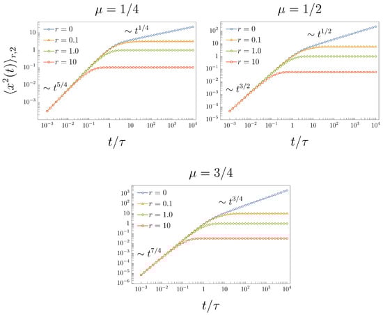 This crossover dynamics of the MSD (38) for different values of and r is shown in Figure 4.