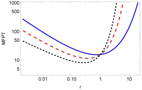 MFPT (31) for , , , (blue solid line), (red dashed line), (black dotted line).