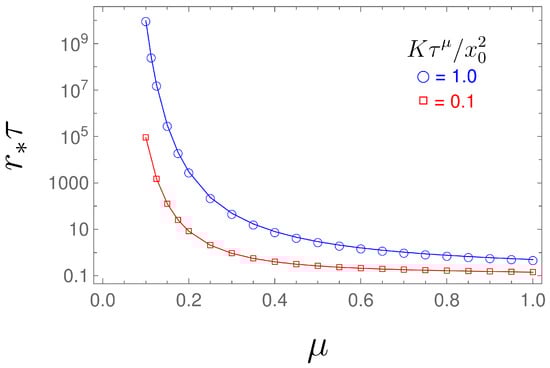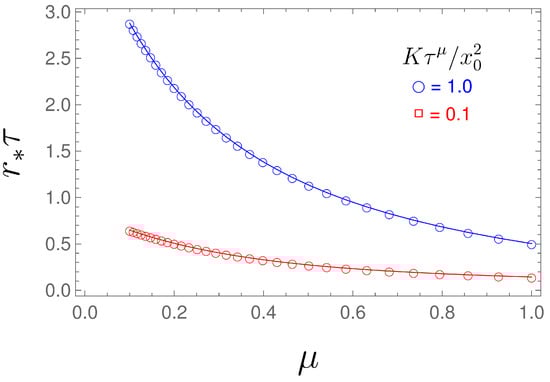 which is a known result []. From (22), we have that in the short-time regime, and in the long-time regime; see Figure 1, curves marked with circle symbols for , 1/2, and 3/4.