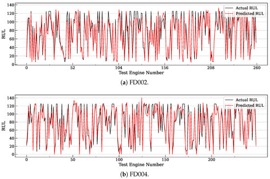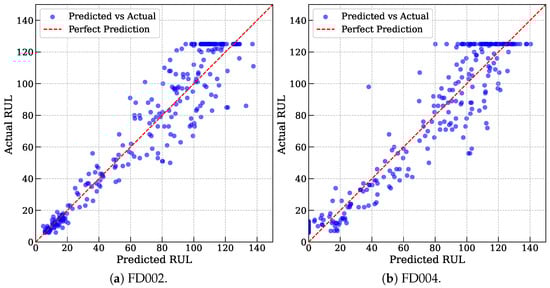 Comparison of MoEFormer’s predicted RUL values against the ground truth for FD002 and FD004.
