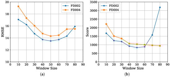 In contrast, as shown in Figure 4b, the Score metric follows a similar overall trend but reveals some dataset-specific differences. When , the Score on FD002 increases sharply, while it remains relatively stable on FD004. This discrepancy arises from the Score metric’s sensitivity to late-prediction errors. Specifically, as L increases, MoEFormer tends to overpredict RUL values on FD002 but slightly underpredicts them on FD004. This behavior likely reflects differences in the underlying data distributions of the two datasets. Overall, these results indicate that while MoEFormer’s performance is influenced by the choice of window length L, the model remains robust within a reasonable range. Optimal values for L can be easily determined through simple validation experiments, with being a reliable choice for both datasets.
