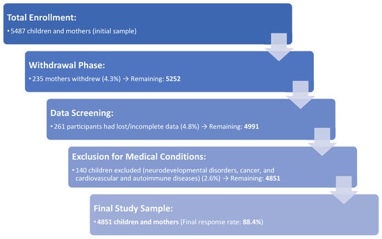 Inclusion criteria: Children aged 6–9 without chronic diseases. Exclusion criteria: Neurodevelopmental disorders, cancer, and cardiovascular and autoimmune diseases (self-reported by mothers). Following withdrawals and exclusion due to incomplete data, the final study sample consisted of 4851 children and their mothers, resulting in a response rate of 88.4%. Ethical approval was granted by the Ethics Committee of the University of the Aegean (protocol no 12/14.5.2016), adhering to the WHO guidelines (52nd WMA General Assembly, Edinburgh, Scotland, 2000). Written informed consent was obtained, ensuring confidentiality. A sequence made the randomization of random binary numbers (i.e., 001, 110, and 110 in which 0 signified assignment and 1 non-assignment to the survey). Sample size calculations (PS software, software version 3.1.2) demonstrated a study power of 87.8%. A flow chart diagram of the study enrollment is depicted in Figure 1.
