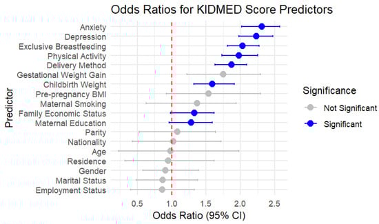 In the binary logistic regression analysis, the educational level of the mothers, family economic status, childbirth weight, method of delivery, exclusive breastfeeding (over the first four months), children’s physical activity, depression, and anxiety were significantly and independently associated with children’s MD adherence (Table 5, Figure 2). In fact, higher adherence to the MD trended toward an association with higher education levels of the mothers (OR = 1.28, 95% CI: 0.96–1.59, p = 0.0292) and family financial status (OR = 1.33, 95% CI: 0.98–1.62, p = 0.0093), though the confidence intervals suggest these effects may not be definitive. Additionally, children with higher birth weight were significantly more likely to have lower MD adherence (OR = 1.59, 95% CI: 1.32–1.91, p = 0.0109), underscoring the potential metabolic influences of early dietary patterns, while similar observations were relevant regarding the delivery method, as children born via cesarean section had lower MD adherence compared to those born vaginally (OR = 1.87, 95% CI: 1.63–2.09, p = 0.0323), noting that children born by cesarean section showed an 87% higher likelihood of presenting low MD compliance. In contrast, maternal pre-pregnancy BMI status and gestational weight gain did not show statistically significant effects (p = 0.2422 and p = 0.2903, respectively).