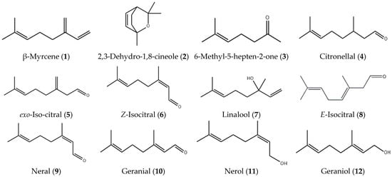 The major components of the leaf essential oil of B. citriodora are shown in Table 2, Figure 2 and Figure 3. Initially thought to be one compound, the major component was called citral because of its lemony aroma and flavor. This terpene aldehyde was found to be a mixture of the two geometric isomers neral 9 (IUPAC Name: (2E)-3,7-dimethylocta-2,6-dienal), and geranial 10 ((2Z)-3,7-dimethylocta-2,6-dienal) also known as citral a and citral b, respectively in the ratio of 1.2–1.5, as shown in Table 2 [].