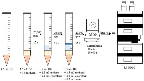Additionally, to measure the total amount of punicalagin in the prepared DEs, encapsulated and nonencapsulated, 1.5 mL of DEs were homogenized sequentially with methanol (1.5 mL), chloroform (2.1 mL) and distilled water (0.5 mL) by using a rotor–stator (Silentcrusher M Homogenizer, Heidolph, Schwabach, Germany) at 20,000 rpm for 15 s (each solvent) to ensure DE rupture and, hence, liberation of the encapsulated punicalagin. Then, samples were centrifuged at 10,000× g for 10 min, filtered (0.22 µm, Millipore filter) and injected into the RP-HPLC (Pt), (HP series 1100 chromatograph, Agilent Technologies, Inc., Santa Clara, CA, USA). The process is schematically described in Figure 1. The system was equipped with a UV-vis absorbance detector HP G1315A or a fluorescence detector 1260 Infinity A (Agilent Technologies, Inc., Santa Clara, CA, USA), Zorbax Eclipse Plus C18 column of 5 µm particle size and 4.6 mm × 150 mm (Agilent Technologies, Inc., Santa Clara, CA, USA).