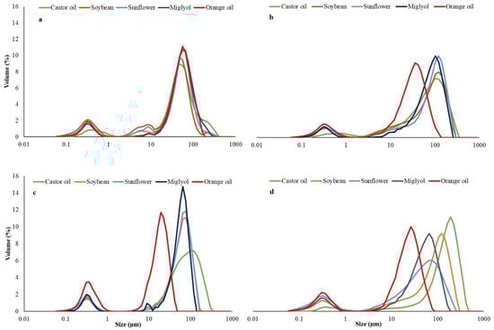 DSD for fresh and 20-day-old samples is presented in Figure 2. All DEs formulated with different oils showed a bimodal size distribution. For the first population, the droplet size ranged between 0.1 and 1 µm, whereas sizes in the range 8–800 µm were observed for the second peak in both fresh and 20-day-old samples.