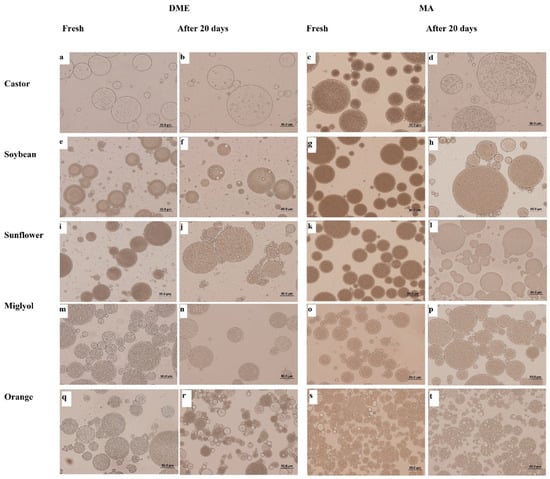 Table 2 shows that there were significant differences (p < 0.05) in the polydispersity of fresh DEs between methods (MA vs. DME), but those differences were not appreciable after 20 days of storage, since polydispersity was statistically the same between both methods used after 20 days. On the other hand, in fresh DEs, there were significant differences among oils when they were prepared by MA, and even larger differences were observed when they were prepared by DME. Moreover, the polydispersity of the emulsions prepared with castor oil was significantly higher compared to those produced with orange oil, indicating that low viscosity oils could produce narrower size distributions. Previous studies by Yuan et al. show that oil viscosity is one of the key parameters on oil drop rupture during the MA process or on the detachment of oil drops from a membrane surface in the DME process [].