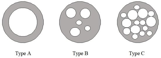 Florence and Whitehill [] classified DEs into three different types depending on the disposition of the water droplets inside the oil drops. Figure 4 shows schematically the three types described: type A represents a small portion of water drops inside the oil drop (generally one drop); type B consists of oil drops with more numerous internal droplets but with smaller size that the ones observed in type A, while type C presents a large amount of water droplets inside the oil drop, making it even more difficult to identify each water droplet. All the DEs prepared showed a type C structure, where tiny and numerous aqueous droplets could be appreciated inside the identified oil drops. However, DEs prepared with castor oil showed a lower concentration of internal water drops when they were prepared by MA, probably due to their large viscosity, which should require large energy to produce internal aqueous droplets in that high viscosity oil. The lower concentration of water droplets after 20 days was also appreciable when DEs with castor oil were prepared by DME. These results are consistent with the smallest change in droplet size and polydispersity for the rest of the oils used, which could be attributed to the significantly lower viscosities of the oils used [,,,].
