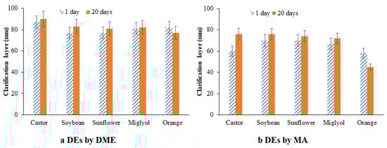 Clarification layer after 1 day and after 20 days of storage. (a) DEs prepared by DME; (b) DEs prepared by MA.