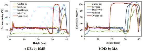 Figure 6 shows the backscattering profiles of the samples after 20 days of storage. At the left part of each graph, it can be easily noticeable that all the samples showed a clarification layer, indicated by the low value of backscattering in this area. The DEs formulated with orange oil where the ones that showed a lower range of clarification layer. Moreover, a large instability of DEs prepared with castor oil was also observed, even when no emulsion was observed when DME was used as preparation method, and large irregularities on the emulsion layer were found when this DE was prepared by MA. This phenomenon indicates that some coalescence could be taking place, producing a nonhomogenous emulsion layer, which was also observed for DEs produced with DME when soybean oil was used as the oil phase, since these were the two oils with larger viscosity values. Moreover, according to Figure 6a, where DME was used as preparation method, an oil layer at the top of the sample when orange oil was used, indicated by a large reduction of the backscattering value at the area corresponding to the top of the cell, can be observed. It is important to point out that flavor oils, frequently used in food and beverages, as it is the case of orange oil, had lower density compared to other mineral and vegetable oils. This flavor oil is more likely to suffer creaming phenomena due to the large density difference with the aqueous phase. Moreover, its large water solubility compared to other oils enhance Ostwald ripening destabilizing phenomena since small oil drops can easily be dissolved in water []. However, this type of oil offers a good alternative for preparing emulsions, which encapsulated some compounds with intermediate solubility in water and oil, as observed by Matos et al. []. Several works were completed in the last decade in which different types of triglycerides are added to flavor oils to inhibit Ostwald ripening phenomena by McClements et al. [] and Park et al. [].