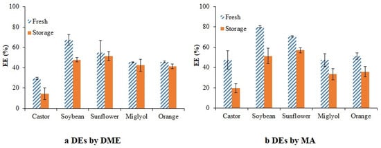 Figure 7 shows the values of EE for DEs prepared by DME and MA methods, both fresh and after 20 days of storage.
