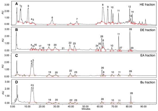 HPLC profiling and bioactivities of Antrodia cinnamomea fruiting bodies from different fractions. (A) Hexane; (B) diethyl ether; (C) ethyl acetate; and (D) n-butanol fractions. (HE: hexane; DE: diethyl ether; EA: ethyl acetate; Bu: n-BuOH).