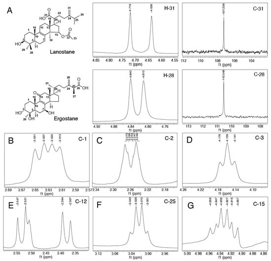 Structural characterization of ergostane-type and lanostane-type triterpenoids. (A) 1H NMR resonance for H−3 and 13C NMR resonance for C-3. The characteristic NMR signal of C1 of (25S)-Antcin K is shown in (B), C2, C3, C12, C25 and C15 in (C), (D), (E), (F) and (G).