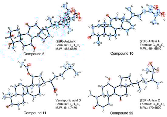 (25R)-antcin C (22) and (25S)-antcin C (23) were identified as a pair of ergostane epimers with the same molecular formula of C29H42O5 by HRMS peaks at m/z 469.3319 and 469.2953, respectively. Their UV and NMR spectra were identical, although they showed different high-performance liquid chromatography (HPLC) retention. The 1H and 13C NMR spectra of 22 almost overlapped with those of 4, except for 3-hydroxyl in 4 instead of 3-ketone in 22, and one more 4-hydroxyl in 4. The absolute configuration of 22 was determined to be 25R by its X-ray crystallography data (CCDC#2099281) (Figure 3).